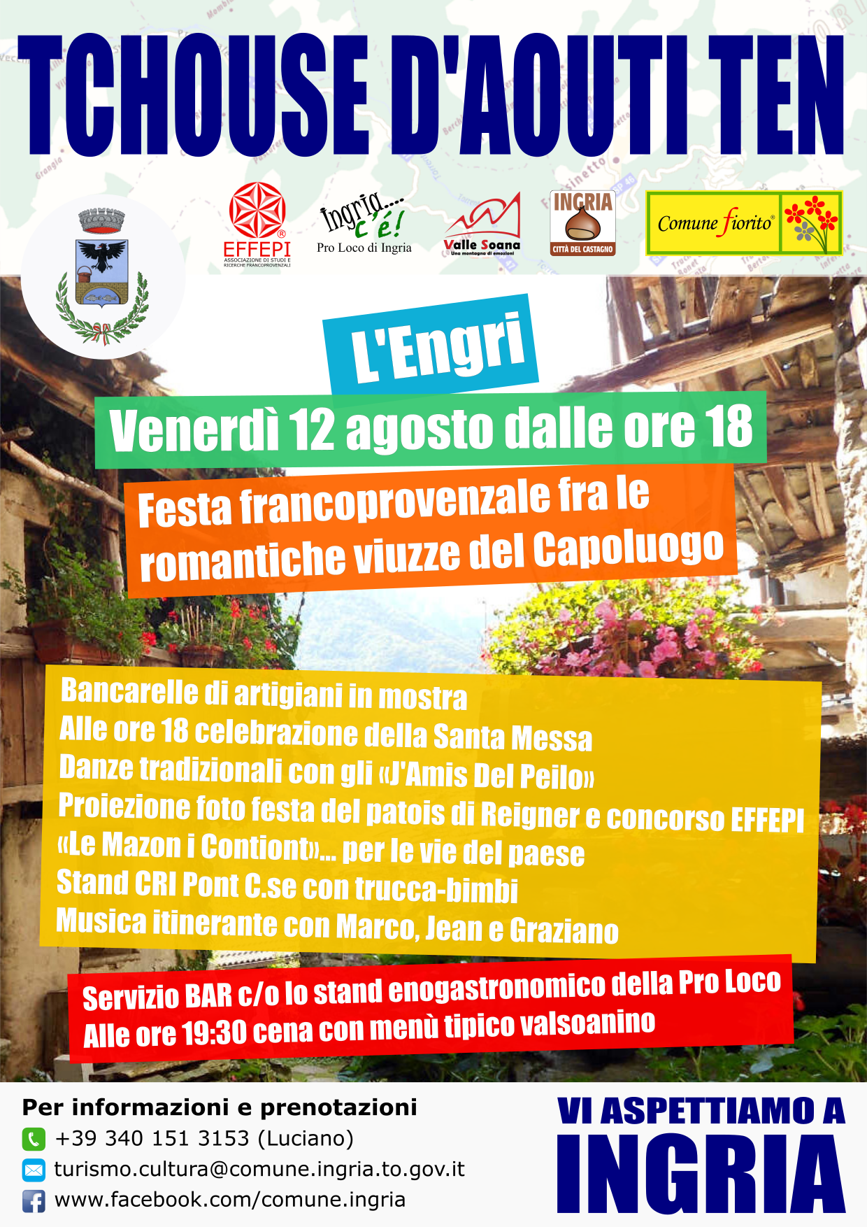 Il Comune di Ingria in collaborazione con la Proloco e l’Effepi organizza “THCOUSE D’AOUTI TEN” (Cose d’altri tempi) per venerdì 12 agosto 2016, l'ormai consueta festa francoprovenzale che si svolge dalle 18 fino a notte fonda. Nel caratteristico centro del paese si troveranno le bancarelle degli artigiani, il truccabimbi nello stand della CRI, la proiezione delle foto della festa del Patois e del concorso Effepi; la musica itinerante: sarà possibile partecipare ai balli tradizionali con gli “J’Amis del Peilo” e ammirare le gigantografie del progetto “Le Case Raccontano”. La festa avrà inizio con la celebrazione della Santa Messa alle ore 18. Presso la Pro Loco un accurato servizio bar e a partire dalle 19,30 cena con tipico menu Valsoanino!