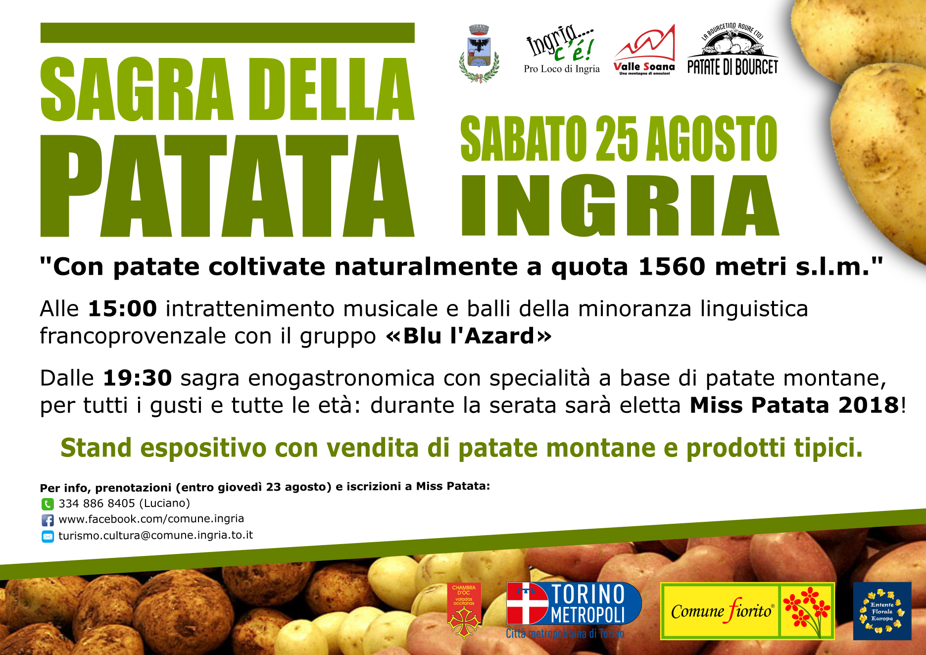 Sabato 25 agosto si terrà a Ingria la consueta Sagra della Patata: a partire dalle ore 15 intrattenimento musicale tipico francoprovenzale e dalle 19.30 cena con premiazione del concorso Ingriese dei "balconi fioriti”, legato alla partecipazione del Comune di Ingria al Concorso Nazionale dei Comuni Fioriti e a quello europeo di Entente Florale.