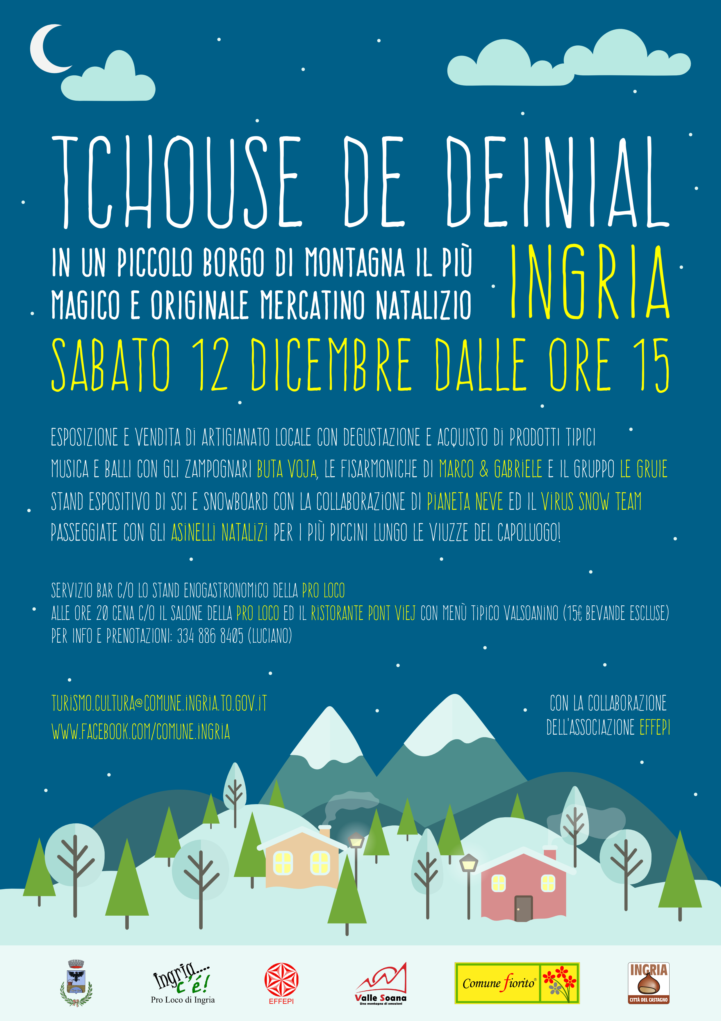 Dopo il successo estivo di "Tchouse d'auti ten" torna in inverno a Ingria la tradizione natalizia con "Tchouse de Deinial"! Sabato 12 dicembre gran mercatino Natalizio nel piccolo borgo della Val Soana con vendita e degustazione di artigianato e prodotti tipici: dalle ore 15 lungo le viuzze e la piazza del Capoluogo sarà possibile vivere l'atmosfera natalizia con musiche e balli tradizionali accompagnati dalle fisarmoniche di Marco e Gabriele, dai cori delle Gruie e dai simpatici zampognari piemontesi del gruppo "Buta Voja"! Faranno parte della manifestazione anche i giovani amici delle piste di Pianeta Neve e del Virusnow team, che allestiranno uno stand espositivo e dimostrativo di sci e snowboard, mentre per i più piccini sarà possibile esplorare il Capoluogo ingriese al dorso di simpatici asinelli natalizi! Dalle ore 20 la serata proseguirà in allegria alla cena con menù tipici presso il salone enogastronomico riscaldato della Pro Loco e il Ristorante Pont Viej (entrambi a 15 euro bevande escluse, consigliata la prenotazione, fino a esaurimento posti!).